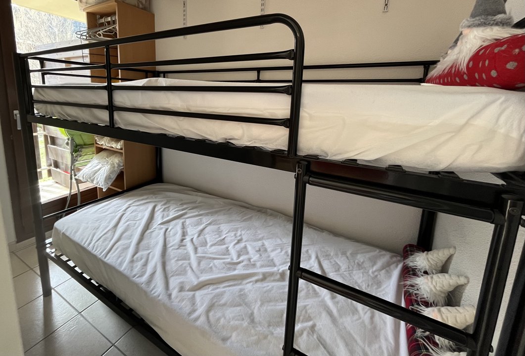Une entrée, une kitchenette avec un espace couchage lit superposés en 90 cm, coin repas, salon canapé et télévisi...