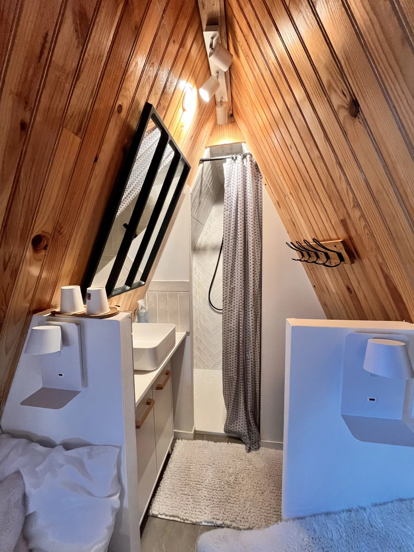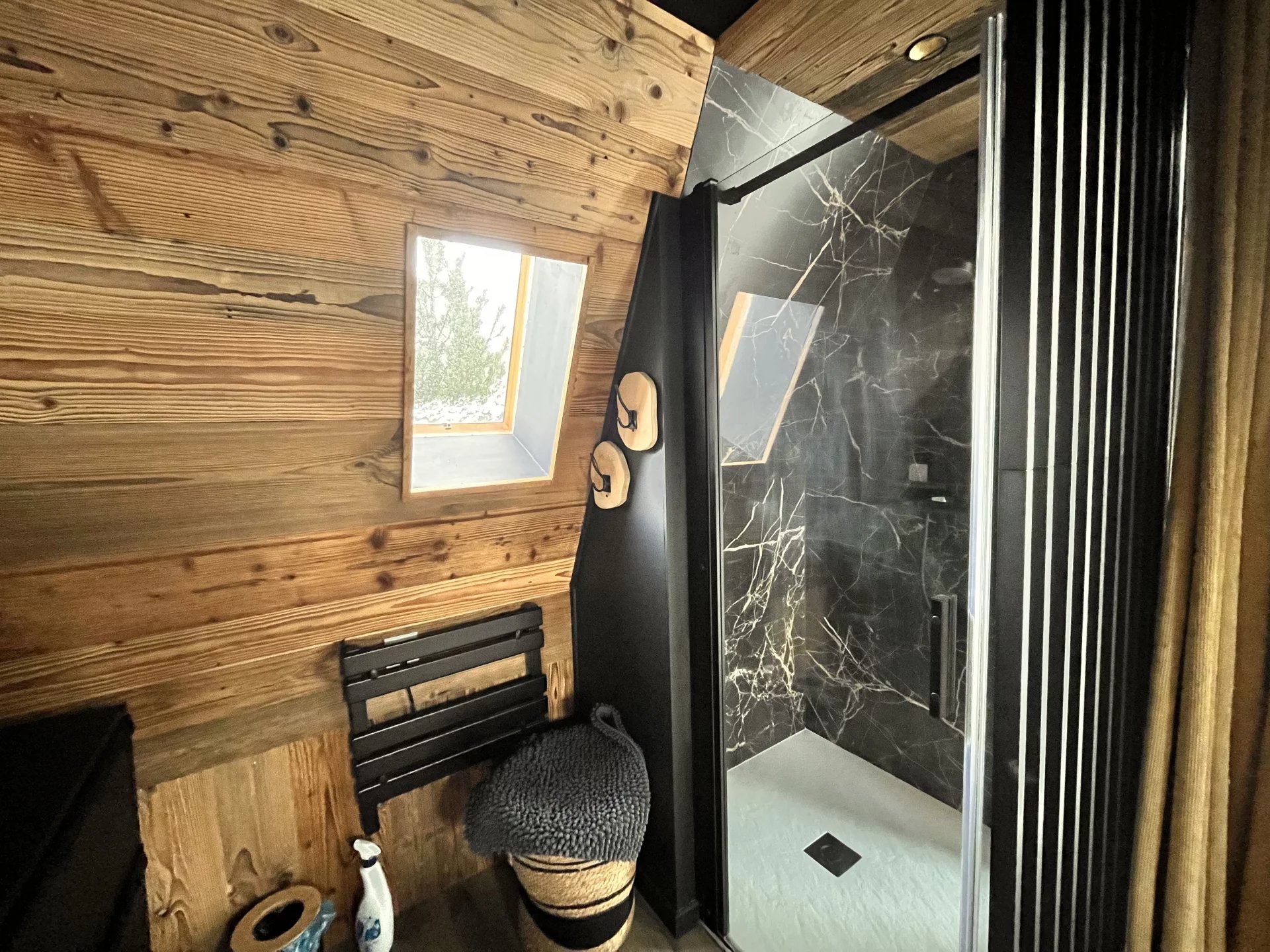 Il est composé, d'une cuisine ouverte, une salle à manger, un séjour avec une cheminée à l'éthanol, une suite parental avec salle d'eau, WC indépendant et une terrasse, un espace couchage, une suite parental avec salle d'eau et terrasse, un WC séparé, à l'étage une chambre mansardée, un espace couchage, une salle d'eau. Une buanderie.